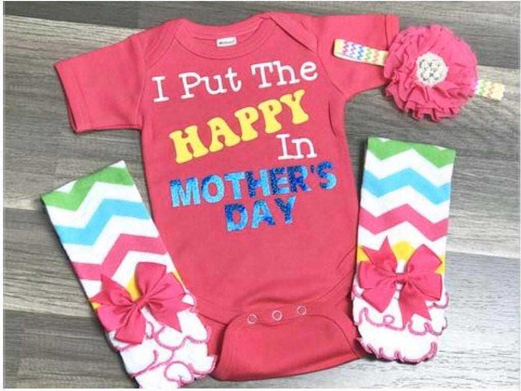 Hot pink bodysuit (NB-24m) or shirt (2-6) with vinyl "I put the happy in Mother’s Day"