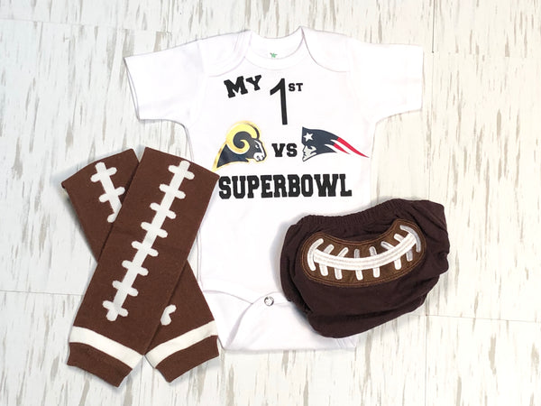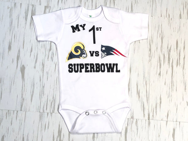 White bodysuit with matte vinyl “My 1st Super Bowl” design.