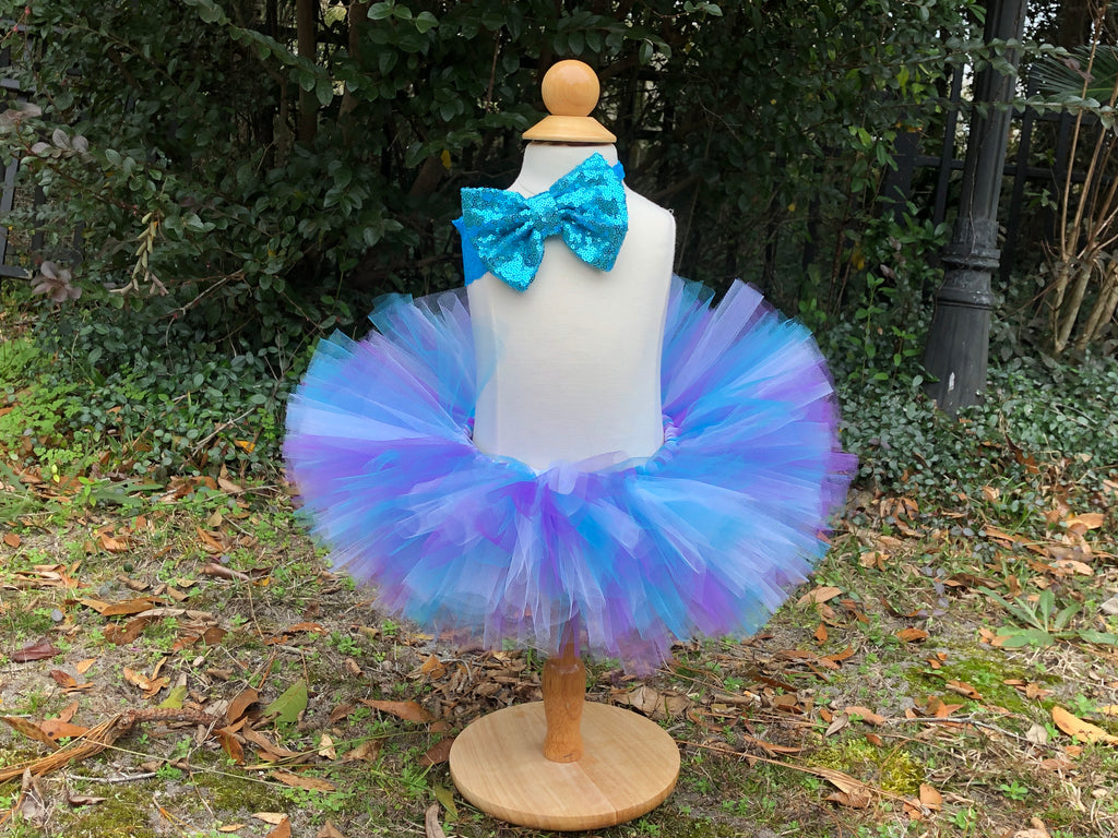 Full and fabulous turquoise, purple and white tutu made from over 70yd of high quality nylon tulle on 3/4” elastic waistband for comfort.
